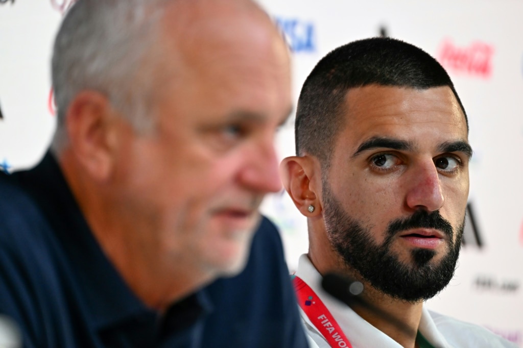 Australia's defender Aziz Behich (R) looks at coach Graham Arnold during a press conference. Photo: Chandan Khanna / AFP Source: AFP