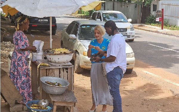 Lawrence Ati-Zigi, the goalkeeper for Ghana’s national football team, the Black Stars, was seen buying roasted plantain with Switzerland’s Ambassador to Ghana, Ms Simone Giger, in Accra.