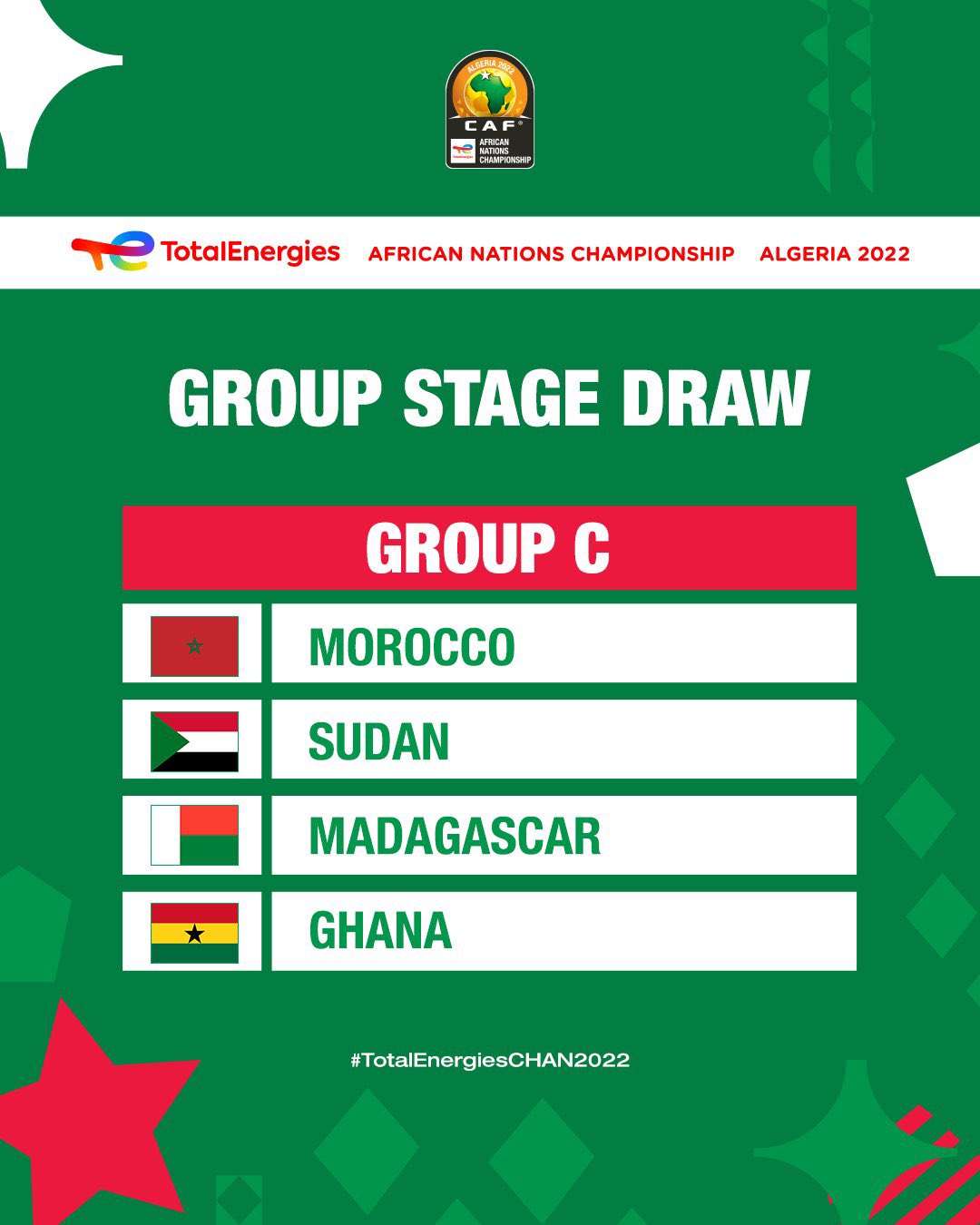 The Black Galaxies will face reigning Champions Morocco in Group C of the TotalEnergies African Nations Championship, Algeria 2022.