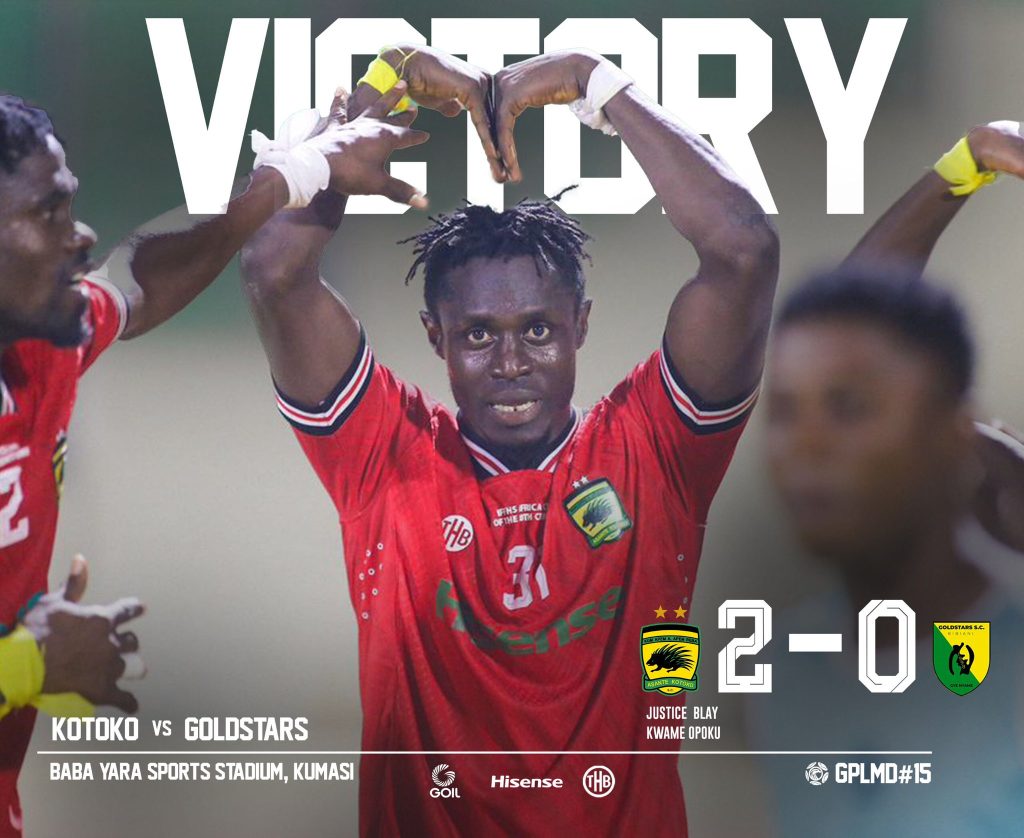 Justice Blay put the Porcupine Warriors ahead in the 18th minute, calmly converting a penalty after Samba’s header was blocked by a Gold Stars defender’s hand. Kotoko continued to control the game, limiting the visitors’ offensive opportunities while creating numerous chances.