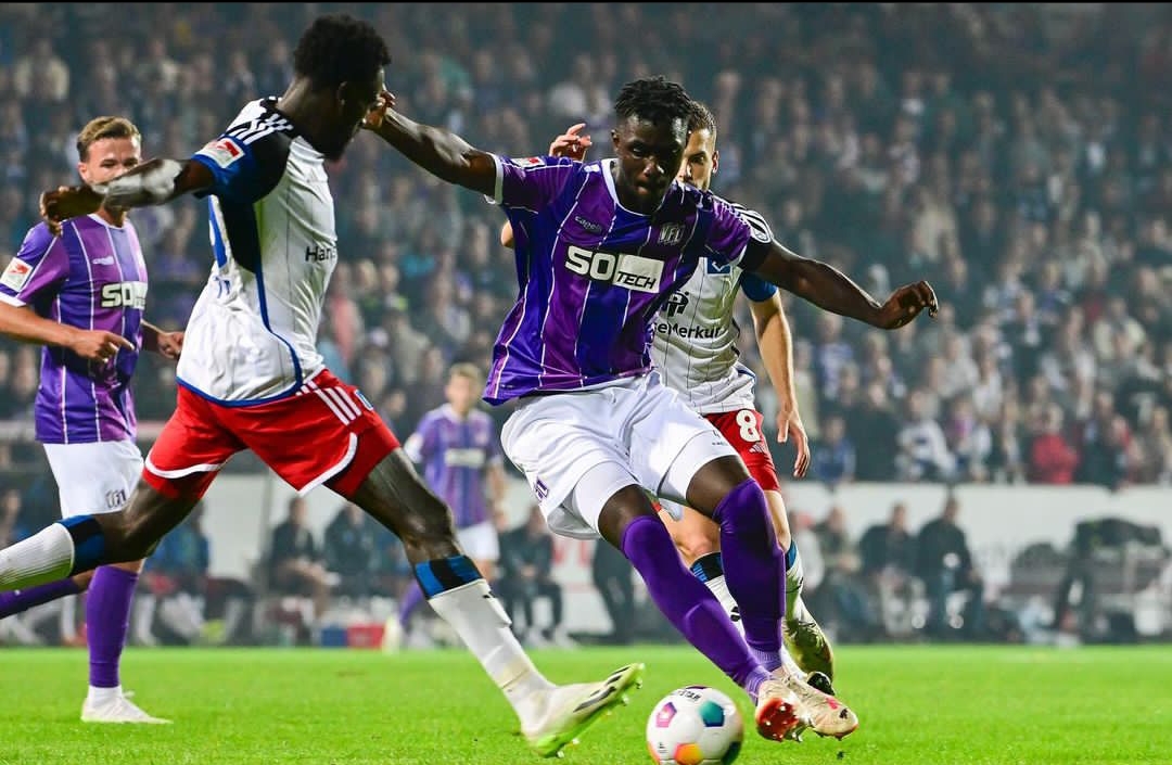 Ghanaian defender Maxwell Gyamfi is happy after his team’s first win in the German Bundesliga 2 against Hamburg SV.