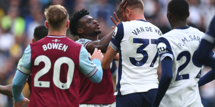 West Ham United star midfielder Mohammed Kudus had a moment of madness as he got sent off for pushing two players in the face during his side’s Premier League clash with Tottenham on Saturday afternoon.